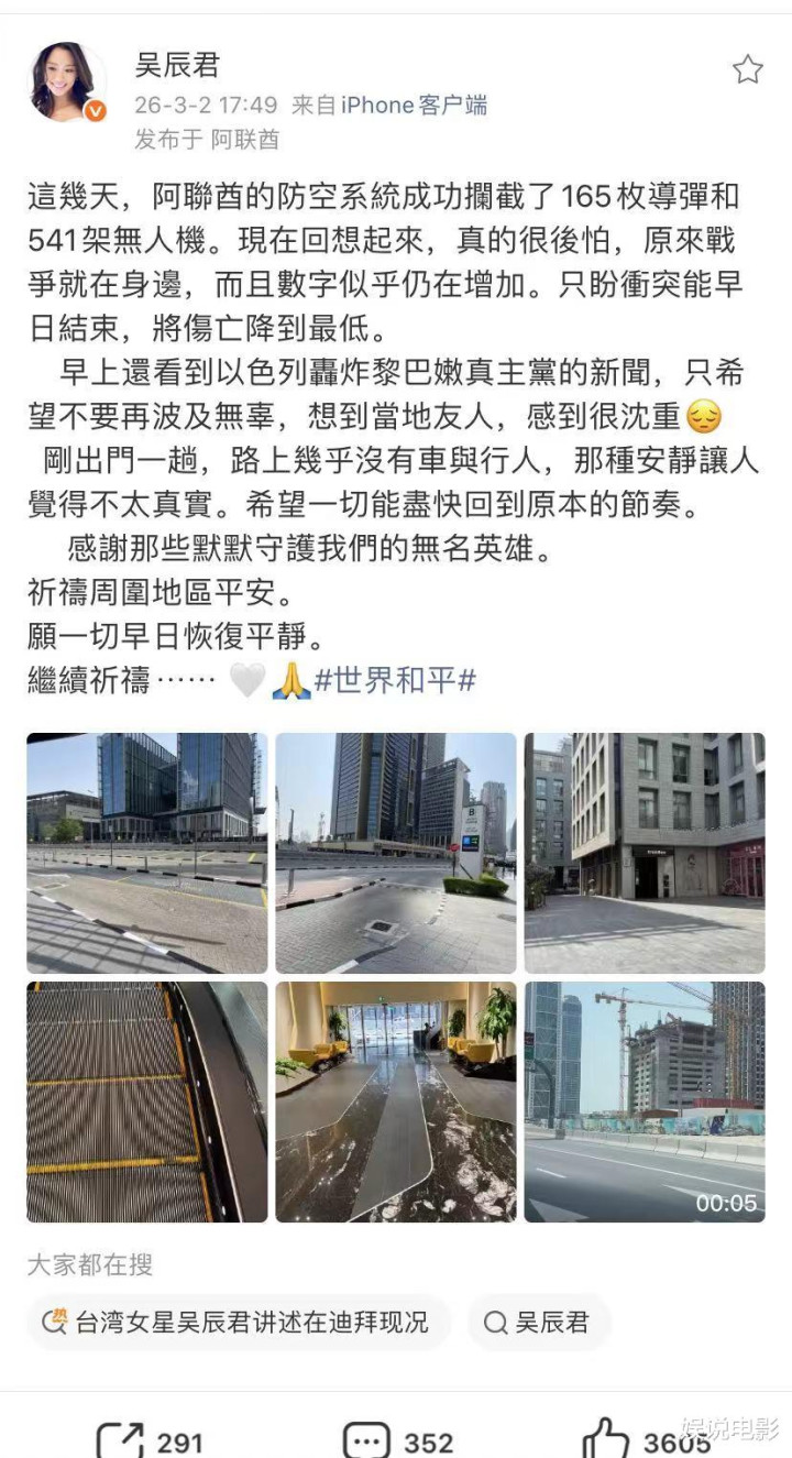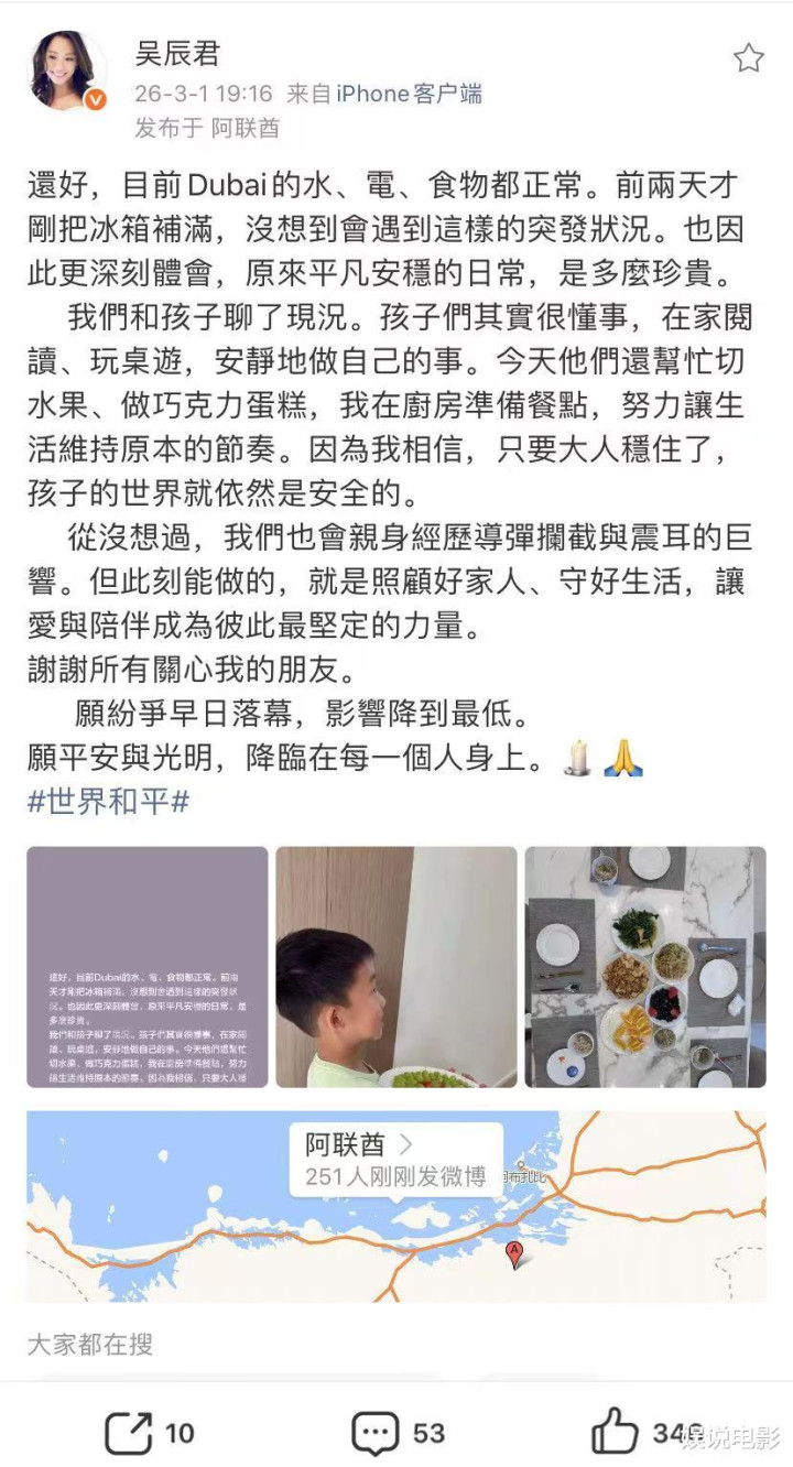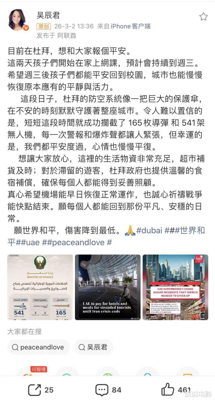退圈女星吴辰君发文透露在迪拜生活情况。